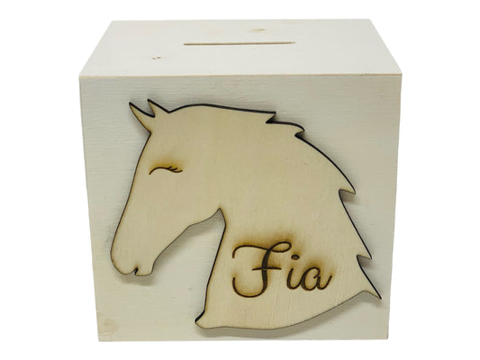 Kinderspardose aus Holz mit Pferde-Motiv